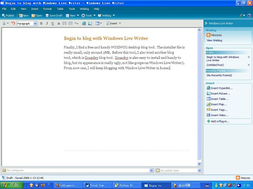 Finally, I find a free and handy WYSIWYG desktop blog tool. The installer file is really small, only around 2MB. Before this tool, I also tried another blog tool, which is Zoundry blog tool. Zoundry is also easy to install and handy to blog, but its appearance is really ugly, not like gorgeous Windows Live Writer:). From now one, I will keep blogging with Window Live Writer in home.